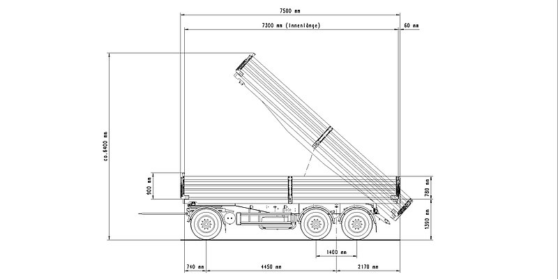 1 hydraulický piest pre trojstranné sklápanie, počiatočná zdvíhacia sila cca 40 t.