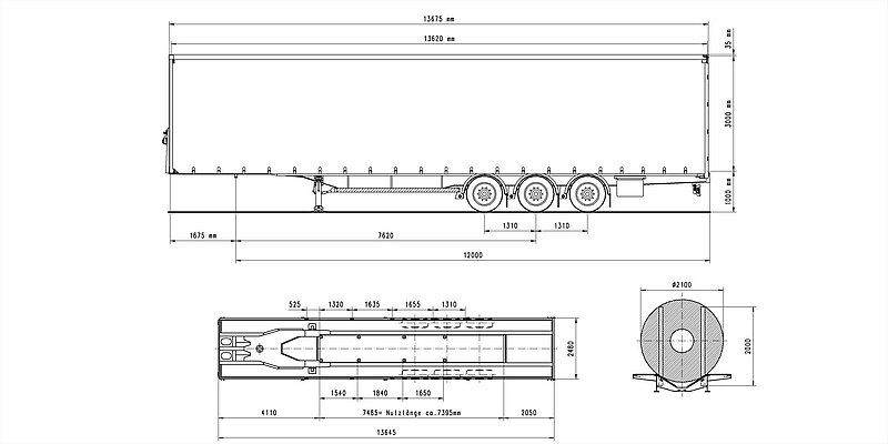 Vnútorná dĺžka ložnej plochy cca 13.620 mm. Vnútorná šírka ložnej plochy cca 2.480 mm. Celková šírka 2.550 mm vnútorná výška ložnej plochy cca 3.010 mm. Bočná nakladacia výška pod vodiacimi profilmi cca 2.855 mm. Vnútorná šírka medzi vodiacimi profilmi cca 2.490 mm. Portálová nakladacia výška cca 2.910 mm. Portálová nakladacia šírka cca 2.480 mm. Ložná výška cca 40 mm nad výškou točnice ťahača.