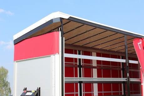 Pevná predná stena z dutých hliníkových profilov do výšky 2.550 mm s 2 stredovými výstuhami, zvnútra 2 ks viazacích ôk pre zaistenie nákladu. Navrchu uzavreté plachtou vo farbe bočnej plachty. Vnútorná strana prednej steny vystužená do výšky 650 mm zinkovaným oceľovým plechom. Po oboch stranách umelohmotné celobočné zhrňovacie plachty v certifikovanom prevedení pre zaistenie nákladu v zmysle kódu XL, s navarenými horizontálnymi a vertikálnymi pásovými zosilneniami vrátane rýchloupínacích spôn, s predným a zadným tyčovým uzáverom, otvárateľné na všetkých 4 rohoch, vzadu s upínacou račňou. Plachta s tesnením k vonkajšiemu rámu. Materiál podľa výberu závodu, farba plachty podľa výberu. Strešný diel plachty zosilnený, priesvitný. Vzadu naskrutkovaný portál s hliníkovými rohovými stĺpikmi, vrchný priečnik so strešnou konštrukciou posuvný dopredu, dvere cez celú vnútornú výšku, s dvoma vo vnútri uloženými tyčovými uzávermi.