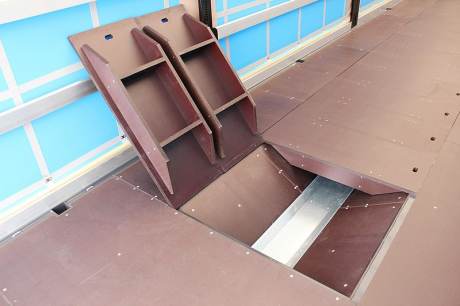 - Krycie dosky lôžka (muldy) z tvrdenej protišmykové preglejky hr. 27 mm s vystužením, umožňujúci prejazd vysokozdvižným vozíkom