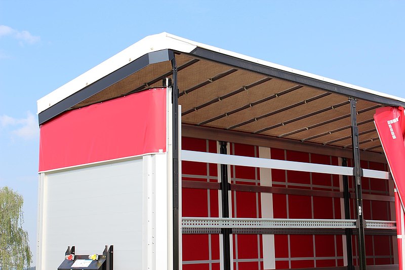 Pevná predná stena z dutých hliníkových profilov do výšky 2.550 mm s 2 stredovými výstuhami, zvnútra 2 ks viazacích ôk pre zaistenie nákladu. Navrchu uzavreté plachtou vo farbe bočnej plachty. Vnútorná strana prednej steny vystužená do výšky 650 mm zinkovaným oceľovým plechom. Na oboch stranách umelohmotné zhrňovacie plachty v certifikovanom vyhotovení pre zaistenie nákladu v zmysle kódu XL, s navarenými horizontálnymi a vertikálnymi pásovými zosilneniami vrátane spodných upevňovacích pásov a plochých hákov s upínacími zámkami z nerezovej ocele s predným a zadným tyčovým uzáverom, otvárateľné vo všetkých 4 rohoch, vzadu s upínacou račňou. Plachta s tesnením k vonkajšiemu rámu. Materiál podľa výberu závodu, farba plachty podľa výberu. Strešný diel plachty zosilnený, priesvitný. Vzadu naskrutkovaný portál s hliníkovými rohovými stĺpikmi, vrchný priečnik so strešnou konštrukciou posuvný dopredu, dvere cez celú vnútornú výšku, s dvoma vnútri uloženými tyčovými uzávermi.