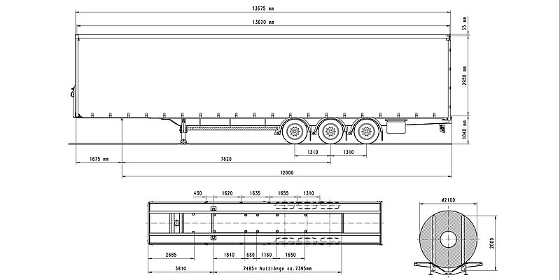 Vnútorná dĺžka ložnej plochy cca 13.620 mm. Vnútorná šírka ložnej plochy cca 2.480 mm. Celková šírka 2.550 mm. Vnútorná výška ložnej plochy cca 2.945 mm. Bočná nakladacia výška pod vodiacimi profilmi cca 2.790 mm.