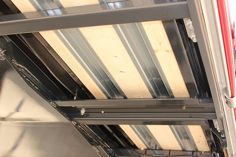 Podlaha z preglejky hr. 27 mm, zároveň s vonkajším rámom. (Zaťaženie podlahy do 5.460 kg = zaťaženie na nápravu vysokozdvižného vozíka v zmysle normy CSC).