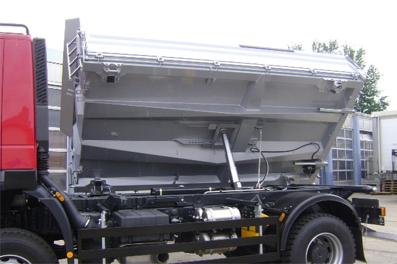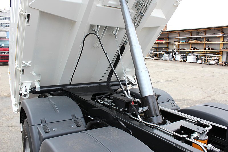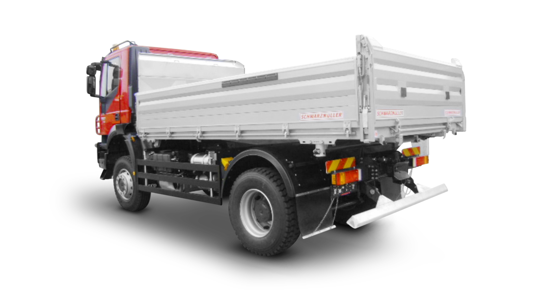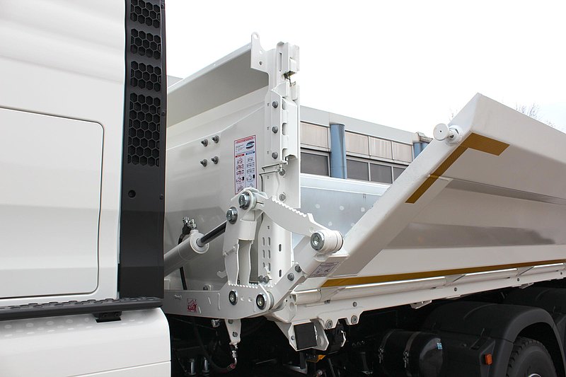 - VOLITEĽNE: na ľavej strane "BORDMATIC" = hydraulicky sklopná bočnica s dvojčinným piestom na prednom čele, ovládaným z kabíny vodiča