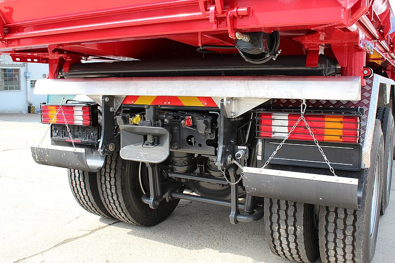 - VOLITEĽNE: na ľavej strane "BORDMATIC" = hydraulicky sklopná bočnica s dvojčinným piestom na prednom čele, ovládaným z kabíny vodiča