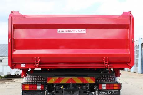 Zadná oceľová stena hr. 4 mm, cca 1.180 mm vysoká, výkyvná so zvýšeným uložením čapov a s pneumatickým uzáverom ovládaným z kabíny.